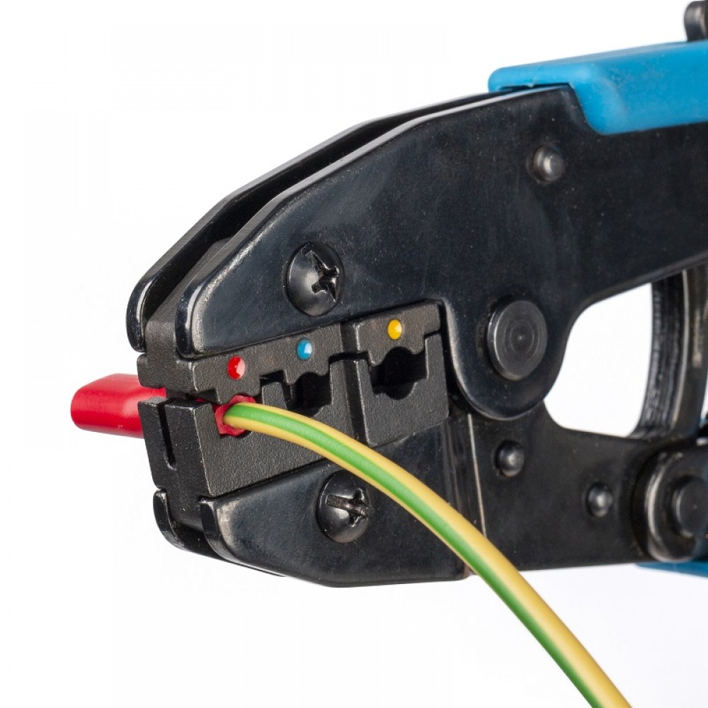 - Опрессовка изолированных разъемов с красной, синей и желтой манжетами